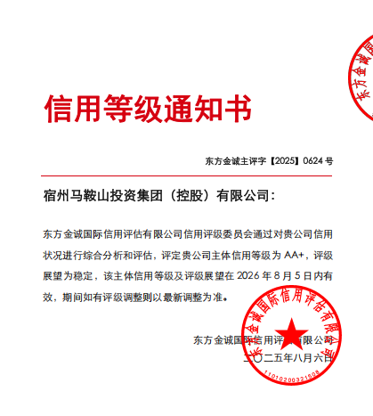 近日,经东方金诚国际信用评估有限公司评定,宿州马鞍山投资集团(控股)有限公司成功获评AA+主体信用等级,评级展望为稳定。